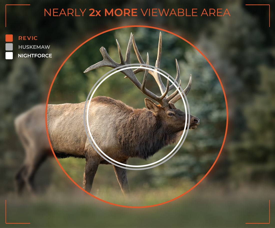Whether you are taking a long shot, or you've stalked in close, a greater Field of View will help you find your mark faster, and let you see more after the shot. At low power, the Revic Acura RS25i boasts nearly 2X the viewable area than the Huskemaw 5-20 or the Nightforce NXS 5.5-22.